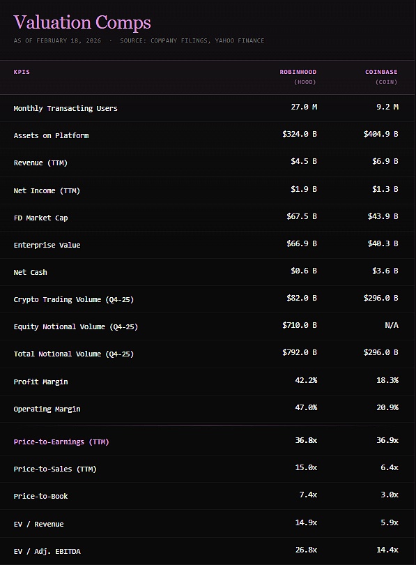 需要注意两点:Coinbase 2025 年的运营支出包括与数据泄露事件相关的 3.45 亿美元,以及数额可观的 Deribit 整合成本,这些成本可以说是非经常性支出。此外,由于营销和获客成本的增加,Robinhood 第四季度的运营支出(与去年同期相比)增长了 38%。总的来说,Robinhood 的成本控制比 Coinbase 更为有效。相对于其收入而言,Robinhood 的运营更为精简。我们认为这主要归因于其业务重点和分销渠道的不同。Robinhood 的目标客户群体是千禧一代和 Z 世代的零售用户。而 Coinbase 则试图同时服务于机构客户和零售客户群体,从而不断拓展产品线,并因此产生了更高的运营费用。