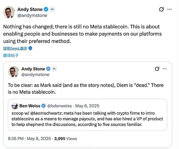 据 CoinDesk 援引多位知情人士报道,Meta 计划在今年下半年重回稳定币市场。然而,与 Libra 时期的高调不同,这一次 Meta 选择了一条更为稳妥的路径:不发行、不主导、不站在台前。Meta Platforms 发言人 Andy Stone 也回应表示:仍无 Meta 稳定币,公司在稳定币业务上的角色更偏向于「支持用户支付」。