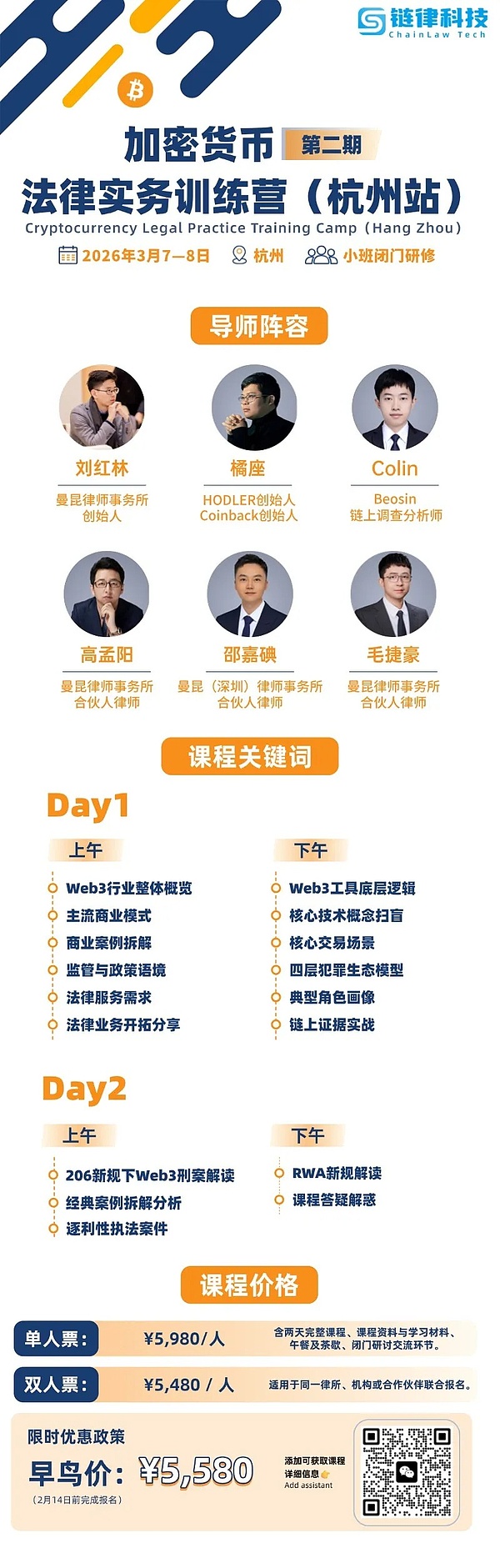 独行快,众行远。Web3合规之路漫长,需要更多有专业底气的法律人共同播种。3月7日-8日,欢迎大家来到杭州线下加密货币法律训练营。 我们不聊虚的,只讲如何应对真实的合规挑战,欢迎一起来探索交流。
