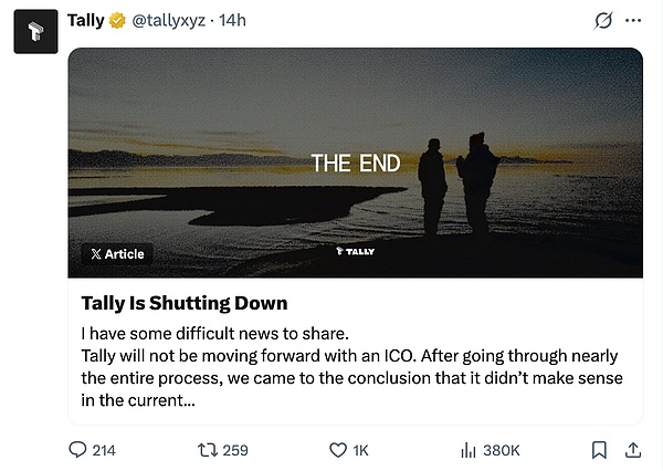 令人意外的是,就在 2 月初,Tally 还对外宣称将启动 ICO,计划在接下来的 60 天内公开记录整个过程,并构建了一个基于 Uniswap CCA 机制的 ICO 筹资平台,以帮助不同规模的团队筹集资本。然而,短短一个月的时间,从准备「扬帆起航」到「折戟沉舟」,Tally 决策的骤变令人猝不及防,这背后究竟发生了什么,使 Tally 转变如此迅速?