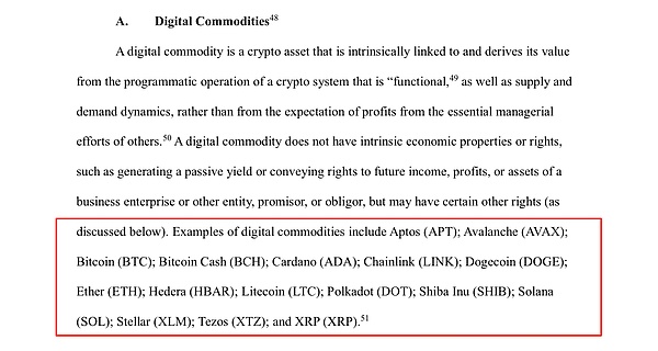 然而,随着美国政府监管态度逐渐转向宽松,加密行业的合规压力显著缓解。例如,美 SEC 在昨日发布的加密资产监管安全港文件中,明确四类加密资产不属于证券,分别为数字商品、数字收藏品、数字工具,以及依据 GENIUS 法案定义的支付稳定币。并在加密资产解释性文件中明确列出 SOL、HBAR、LINK、ADA 等 16 种数字商品示例,称这些资产均不属于证券范畴。