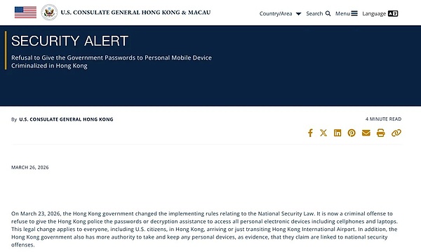 最近在币圈里有一条传播很广的信息,大致是:香港已经可以要求交出电子设备密码,不配合会构成犯罪,甚至连硬件钱包也可能被覆盖。这类说法的直接来源,是美国驻港澳总领事馆在2026年3月发布的一则安全提醒。原文写得其实相当直接: