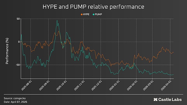 这说明,仅靠回购并不足以推动代币价值持续上升。其他因素同样关键,包括整体市场的回撤、代币释放计划与锁定期解锁、赛道叙事变化,以及协议整体市场情绪等。这些因素将在后续章节中进一步探讨。在此之前,我们先对比两个收入最高的协议及其代币表现:Pumpdotfun 与 Hyperliquid。从下图可明显看出,在两者均积极执行回购计划的期间,HYPE 表现更优(HYPE 的年化持有者收入约为 6.6 亿美元,PUMP 约为 3.8 亿美元),这主要得益于协议整体情绪更佳,以及市场对未来供应冲击与代币解锁的预期定价。