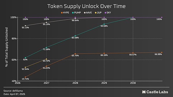 下图展示了若干固定供应代币的供应解锁速度。尽管大多数代币最终都会完全解锁,但其节奏差异显著:PUMP 的解锁速度最快,而 HYPE 最慢。通常而言,较慢的解锁安排更受青睐,因为它降低了突发性供应冲击及市场难以消化的抛压风险。对于 AAVE 和 SKY 等代币,大部分供应已解锁;而 JUP 的长期解锁计划则由 DAO 治理决定,属于非确定性释放。
