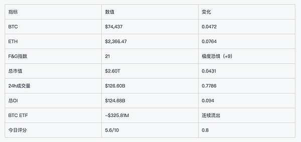 指标数值变化BTC$74,4370.0472ETH$2,366.470.0764F&G指数21极度恐惧(+9)总市值$2.60T0.043124h成交量$126.60B0.7786总OI$124.68B0.094BTC ETF-$325.81M连续流出今日评分5.6/100.8