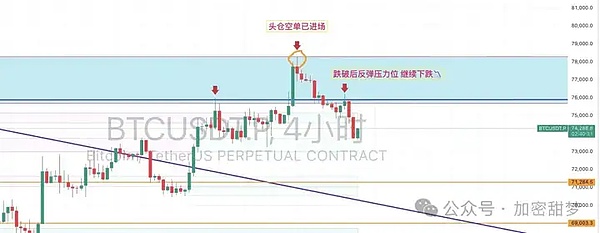 BTC早上收长上影线实体阴线,日线两连跌,目前给的78高位做空策略,到现在为止浮盈5000点,而且很标准的跌破76反弹压力位,持续下跌趋势。