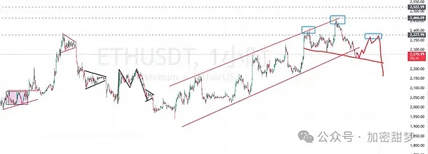 ETH价格已经跌破了上升通道,日线级别已经出现见顶信号,目前来看1h级别有反弹需求,所以反弹上去到位置直接空就行,预计反抽高点在2350-2380。