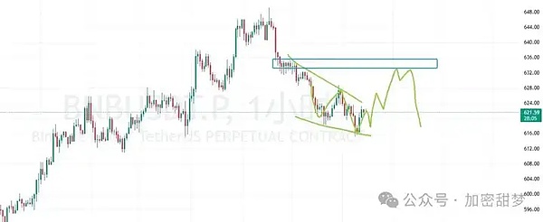 BNB小级别来看有反弹需求,连续下跌后出现看涨楔形,意味着短期可能要反抽一波,但日线级别已经出现见顶信号,所以也只是小反弹行情,预计高点在635附近,到了可以看情况进场做空!