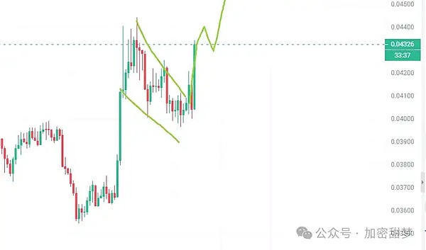 CHZ世界杯所带来的利好炒作会让chz走独立行情,现在形态处于上涨旗型了,如果小级别未能突破站稳的话,估计还要回踩蓄力一波,可以关注下边沿线0.038附近的支撑线,回踩这里可以进场多单,因为现在价格触及压力线附近追多的性价比不是很高,建议等回踩进场多。