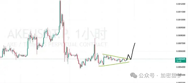 AKE可以关注一下,有二次上涨的迹象,短期持续震荡做了一个三角形态,但指标基本修复的差不多了,所以震荡结束大概率向上突破一波,我已经在现价0.0005附近小仓位多了一下,准备博一个突破。