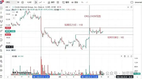 过去几天CRCL虽然有反弹,但整体走势依然偏弱,目前尚未跌破102支撑位,底部仍有买盘支撑; 4月17日下跌虽带量,但未跌破4月16日低点,底部在缓慢抬高。 综合来看,CRCL大概率仍将在102-110区间窄幅震荡,并有望再次测试110压力位。